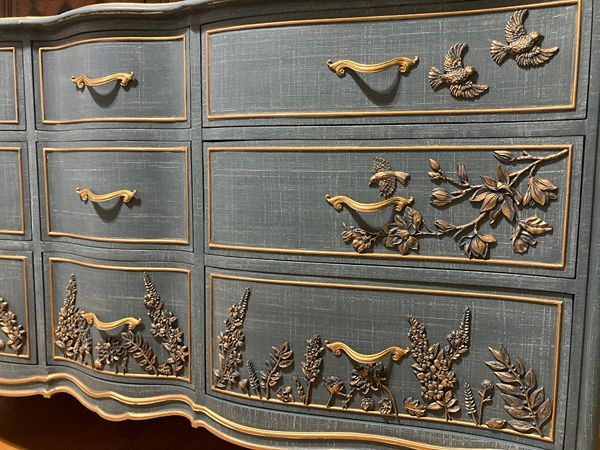 Elegant Drexel Touraine, Denim Textured Dresser w/Hand Poured Floral & Bird Molds Photos