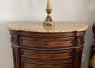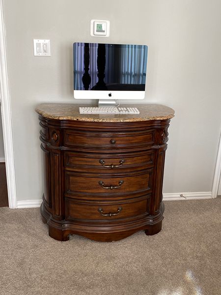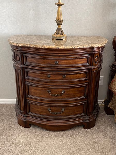 Elegant mediterranean style bedroom furniture. The set includes one king bed (headboard, footboard and side rails), two marble-topped bedside tables and one gentlemen’s cabinet. The gentlemen's cabinet includes antique brass finish hardware, beveled mirrored doors, an interior clothes rod and two felt lined tray drawers, a slide out back panel for TV. This Casa Cristina Pulaski set was purchased from Star Furniture. Minor nicks and scratches commensurate with use and moving. Sold as is. Heavy. Must bring your own muscle power, moving materials and transportation. Please include your telephone for a call back. Pickup in Spring (99 & Rayford Rd). No holds. (Posted 11/28/2025)