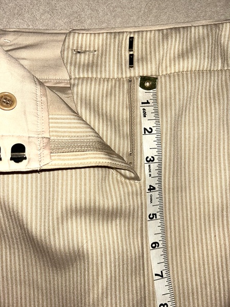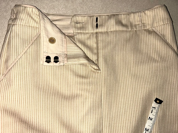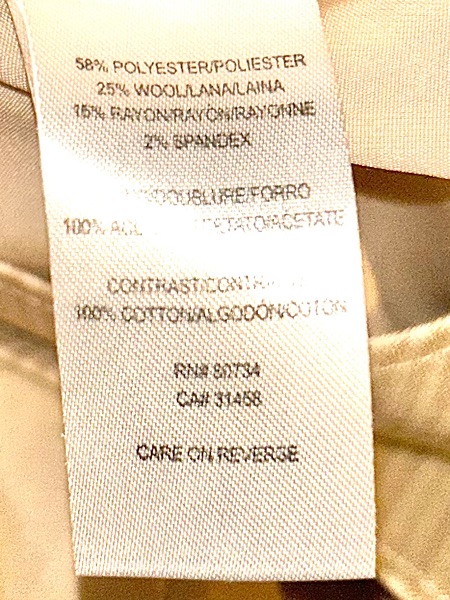 "Joey" pattern pinstriped skirt in soft camel colors. Skirt is lined, size 0, with short front zipper, double hook closure, belt loops, front and back pockets, and high-low hem. Material is polyester/wool/rayon/spandex with acetate lining. Dry clean only. Very good condition from smoke free home. $5