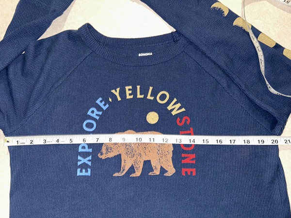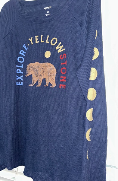 Explore Yellowstone women's relaxed thermal long sleeve tee. Brand is Sonoma (Kohl's), size medium, dark blue. Front has a bear graphic and left sleeve has the phases of the moon. Light wear/fading but no holes or tears. Cotton/polyester blend. Smoke free home. $3