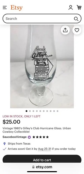 Hello Urban Cowboy fans! This is for you, a perfect condition, vintage 1980's Gilley's Club Hurricane glass. On the back is the Nesadel club, also owned by Mickey Gilley. measures 10"H x 3.25"D…$25 firm
