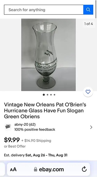 Pat O’Brien’s New Orleans, LA Hurricane glass- great condition…$10 firm ($5, if you purchase both!)