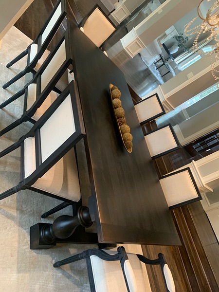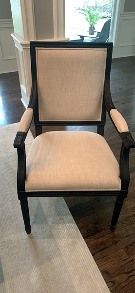 Restoration Hardware 17th C dining room table. Black walnut 96"L x 44"W x 30"H. Prestige shape. 6 French square back upholstered cream chairs and two captains chairs. Rug included. Retails over $9000 will sell for $3500.