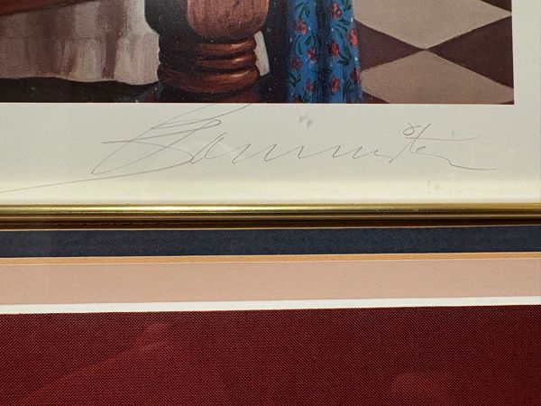 The art work depicts two young women in a kitchen setting, engaged in the activity of baking, with ingredients like apples and a rolling pin visible on a table. Pati Bannister is known for her romantic and nostalgic art, often featuring young women and themes of childhood or domestic life. The ART work comes with a matted fantastic frame in pristine condition. Produced in 1990, this contemporary piece reflects the style of illustration art and is an original print from the United States. The artwork is a unique and collectible item that would make a lovely addition to any art lover's collection.