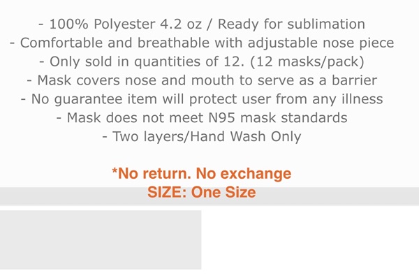 BAW Athletic Wear adult face masks, one size, style FM 1005. These are 2 layers with adjustable nosepiece, and they can be used in sublimation. These come 12/pack and are currently selling for $40/pack online. They are new and only removed from package long enough to get a picture. I have 28 of them. Smoke free home. $5/all