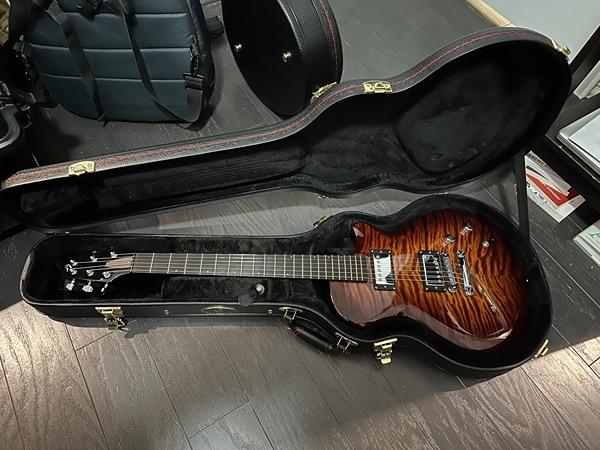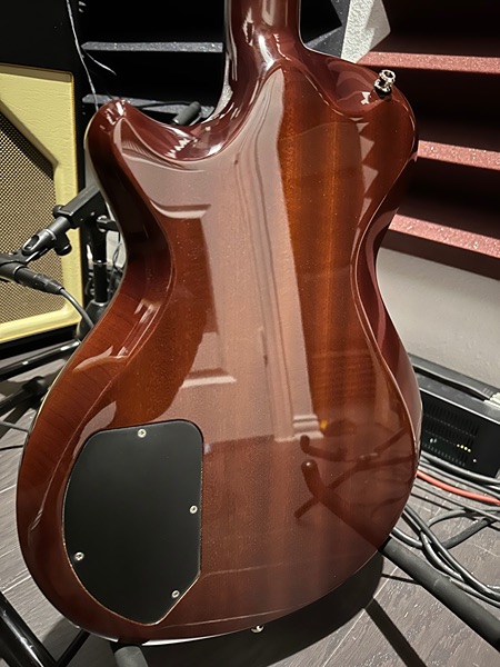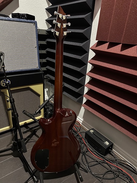 The Mark IV is a single cutaway chambered mahogany alder or mahogany body, AAA figured maple top, set C-shaped barrel-carved neck, ebony fingerboard with small pearl dot inlays, three-per-side Gotoh tuners with ebony buttons, TonePros tune-o-matic bridge, stop tailpiece, two Seymour Duncan humbucker pickups, with silver hardware.