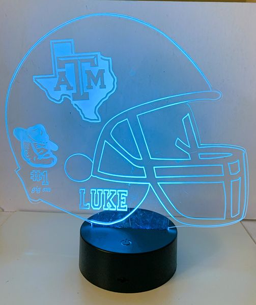 Multi-colored (red, blue, yellow, white, aqua, green, violet) LED light display, touch action on and off & color change in base, 3 AA batteries (not included). Clear acrylic football helmet topper inserts into plastic base. Approximately 9” square including base. MicroMagic Store. USA. Great condition. Works. Personalized “Luke”.