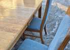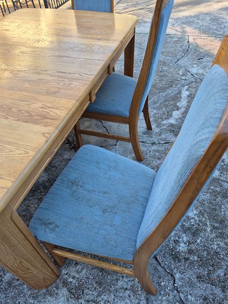 Dining table with 6 chairs. Table has scratches and wear. Chairs need to be cleaned.