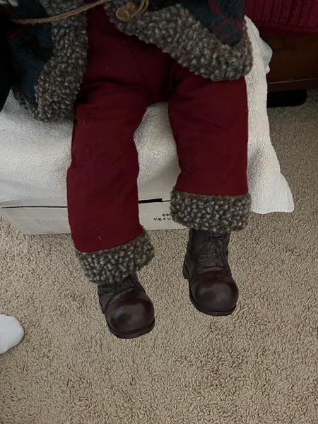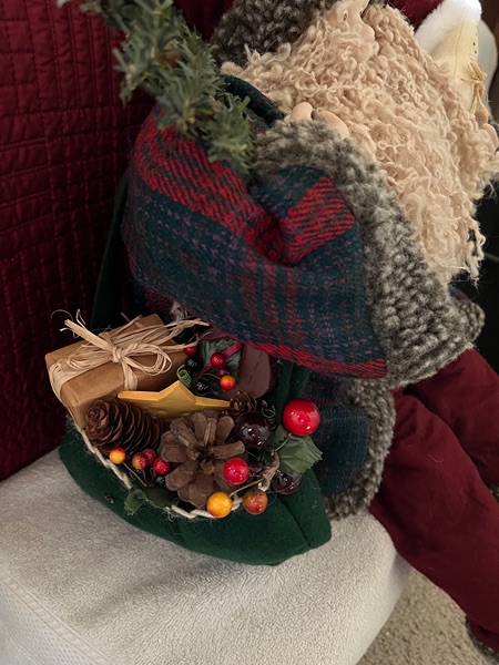 Wonderful Stuffed Sitting Santa - fabric clothing, porcelain face and hands. Fabulous details! Please see all of the pictures for the details. Santa needs a new home due to downsizing. From smoke-free environment.