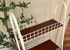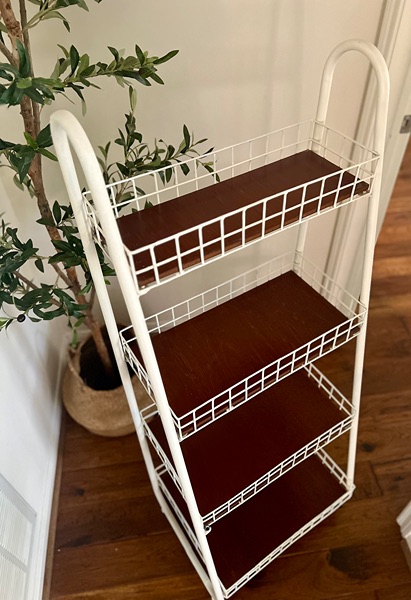 Tiered bookshelf with four shelves of varying sizes. Shelf measures about 53 inches tall and is almost 21 inches wide. $50, porch pickup in The Woodlands.