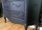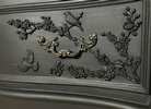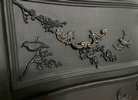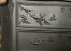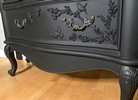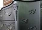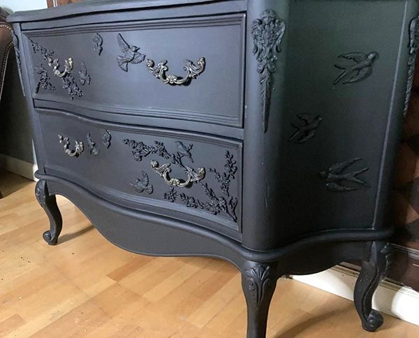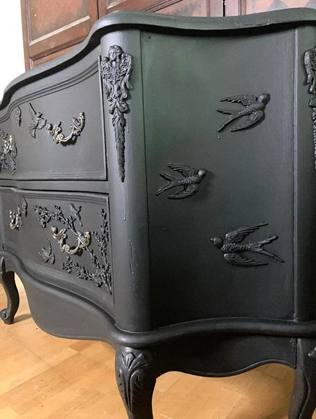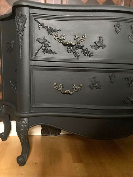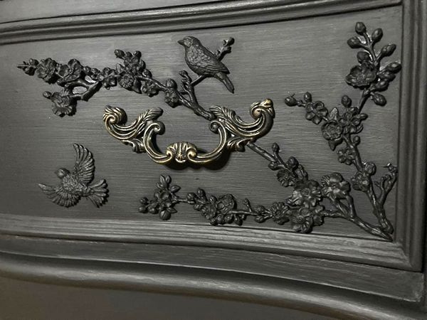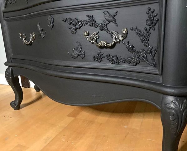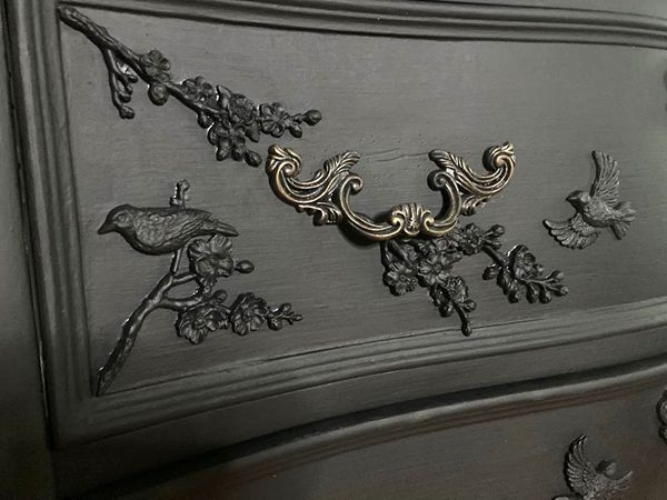 - We cleaned, filled, sanded, primed, added flat velvety black paint in layers, hand poured and applied moulds of birds and branches and florals, then sealed in a flat poly for durability.