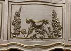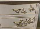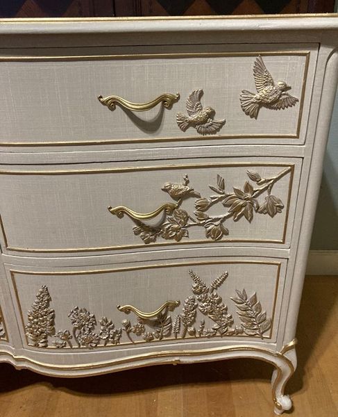 - We cleaned, filled, sanded, primed, added worn linen texture paint and glazed in layers. We hand poured molds of flowers and birds and composed them on the drawers. We layered the glaze in soft neutral beige color then gilded the molds and highlighted the trims. Then we sealed with polycrylic for durability.