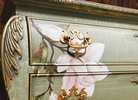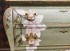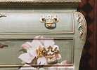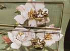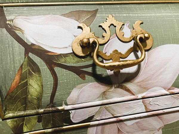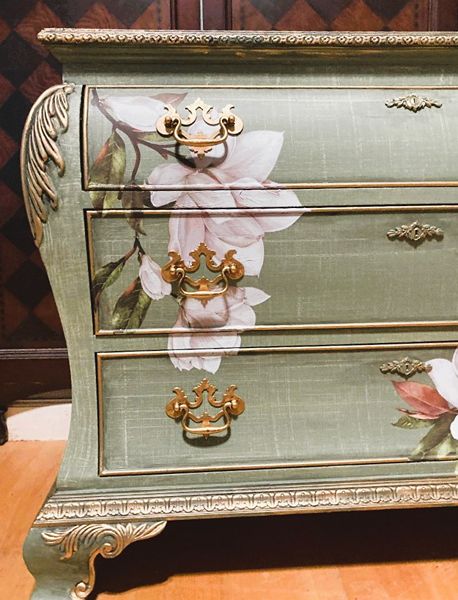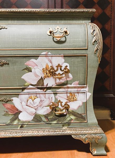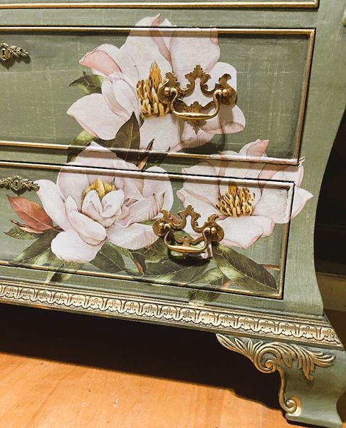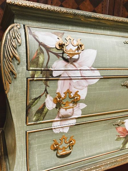- We cleaned, filled, sanded, primed, texturized with a gorgeous hand applied linen technique in multiple layers, gilded, added Beautiful magnoia blooms for a welcoming, high end design. We then gilded and sealed entire piece with polycrylic for durability.