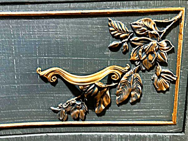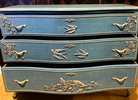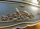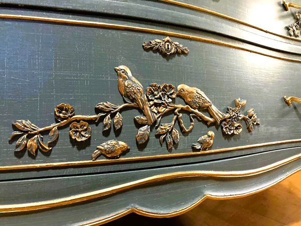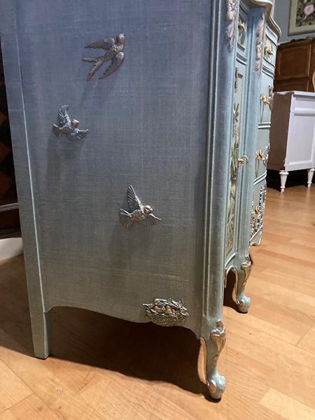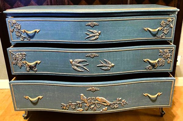 - We cleaned, filled, sanded, primed, added worn denim texture, applied hand poured moulds of birds and branches then painted in layers, gilded and sealed for durability.