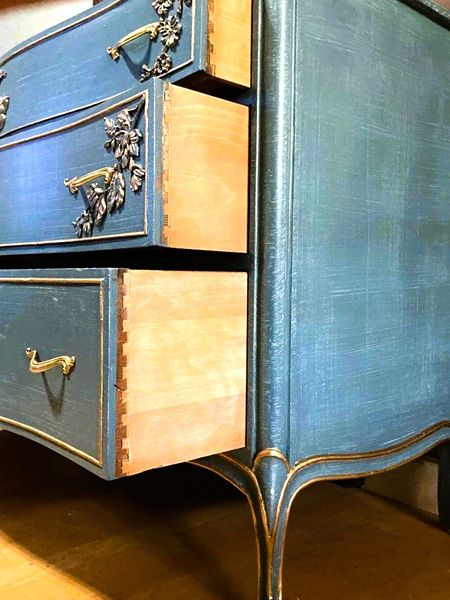 -The drawers are sturdy, dove tailed and glide smoothly, with original polished and lightly gilded hardware.