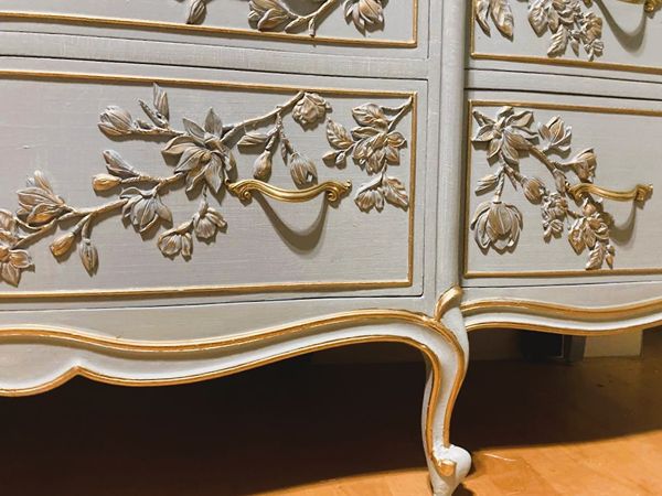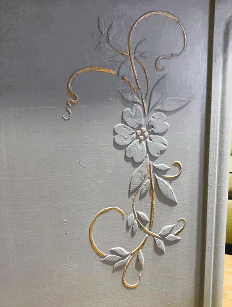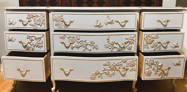 - We cleaned, filled, sanded, primed, texturized with a gorgeous hand applied linen technique in multiple layers, gilded, added hand poured magnolia blooms and branches with bird moulds for a high end design. We gilded and then sealed entire piece with polycrylic for durability.