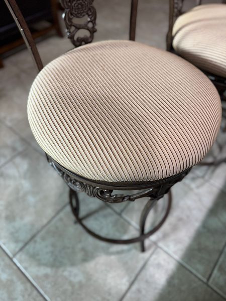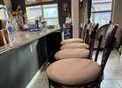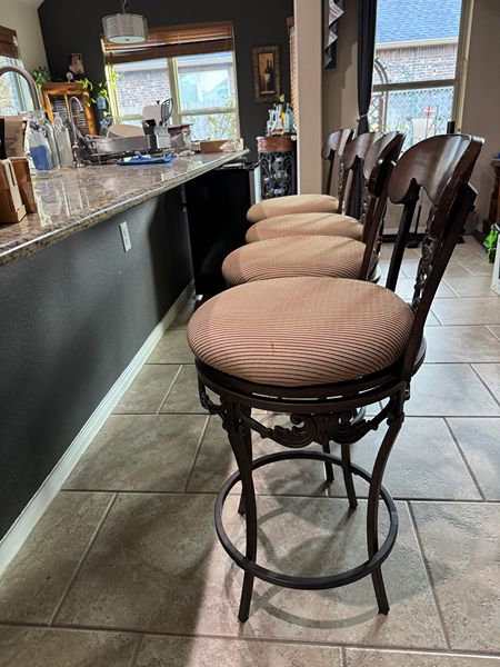Four metal frame upholstered seats bar height stools, 360-degree rotation, very sturdy in general use condition, seat height 27", wooden back height 39", seat size 19" in Dia, comfortable, $100 for the four bar height stools.
