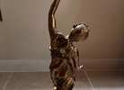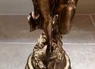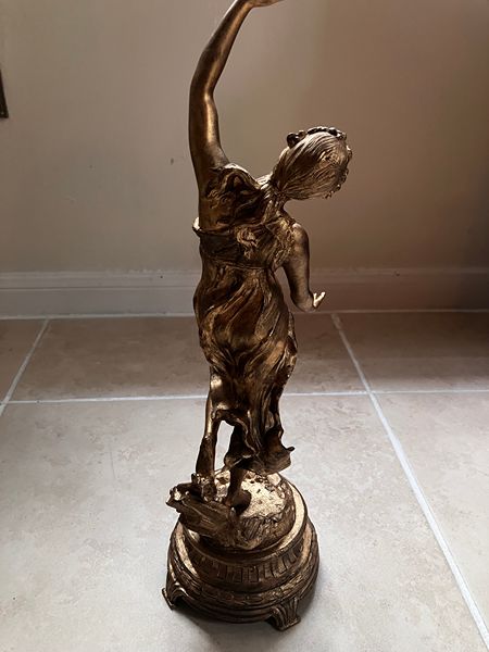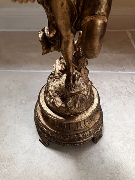 Antique spelter statue with jeweled cabochon brass Filagree shade overall 24" tall shade is 8" tall and 5 1/2" in diameter. Statue was at one time wired as holes exist.