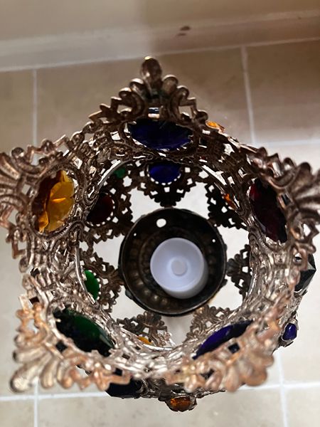 Spelter & Brass Lamp w/Jeweled Cabochon Filagree Shade - Antique Photos