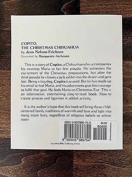 This is a story of Copito, a Chihuahua who accompanies his mistress Maria to her first posada. He witnesses the excitement of the Christmas preparations, but after the third posada he chases a jack rabbit into the desert and gets lost. Being a tiny dog, Copito is scared. But he has made up his mind to find Maria, and his adventures give him courage to fulfill that goal. He finds Maria on Christmas Eve. This is an informative, entertaining easy-to-read book. How to create pinatas and figurines is added activity.