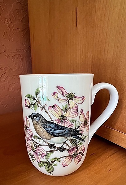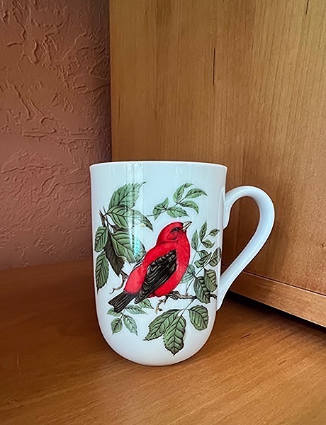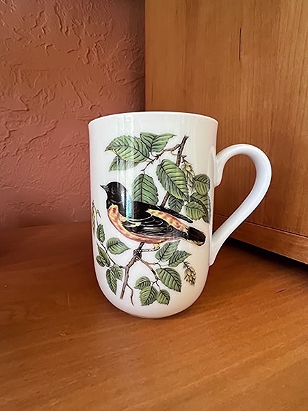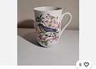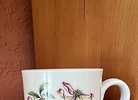 Featuring birds and flowers. Each measures approx. 4" high, 4" rim to handle, 2 3/4"diameter at mouth.