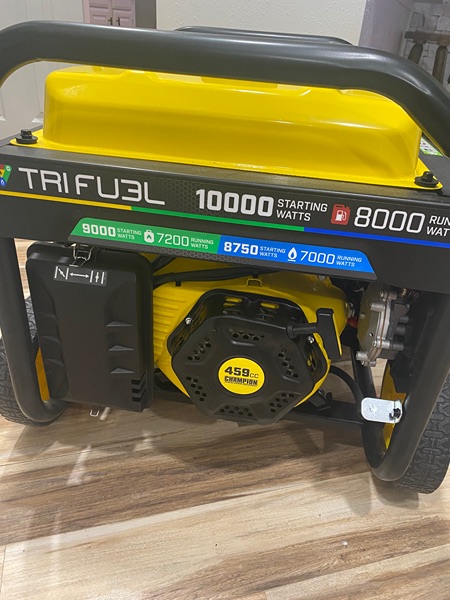 10000 starting watts, 8000 running watts, 459cc engine. Purchased 2 years ago. Custom cover included. Electric start. Run twice on natural gas under covered patio. Oil changed twice, too. Easy connect and disconnect. Husband will demonstrate how generator works. We are selling portable generator because we had a Generac installed. Cash or Venmo