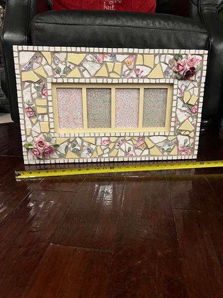 Nice mosaic picture frame holds 4 ~ 5"X7" photos. Pretty pinks, rose, whites, sage and soft yellow ceramic pieces. Beautiful ceramic roses for accents on the corners. Wonderful gift idea. Frame is a nice 25" X15". Porch pick up located I-45 and Rayford Road. Only $15 cash