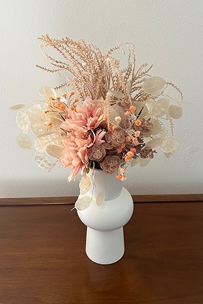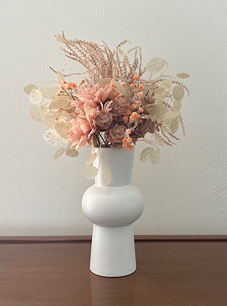 White vase with assorted arrangement. Approx. 20” tall…$25 firm