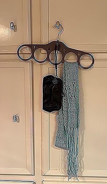 -scarf & belt holder holds at least five scarves and multiple belts etc. (Small piece on the right side came off but doesn’t affect use)…$12 firm