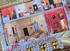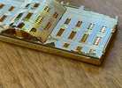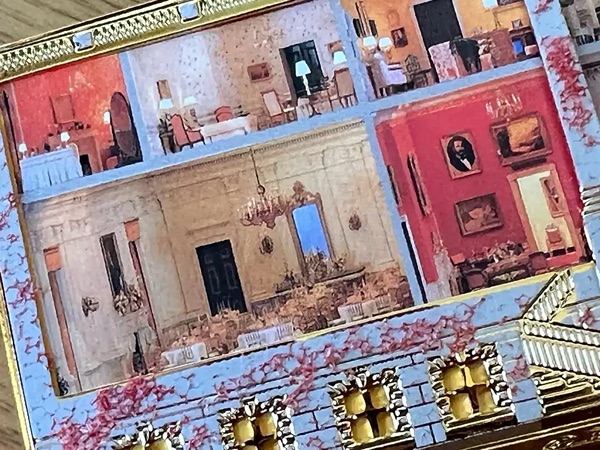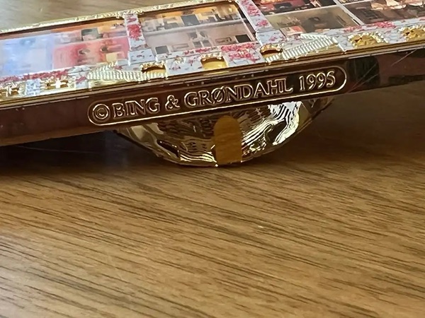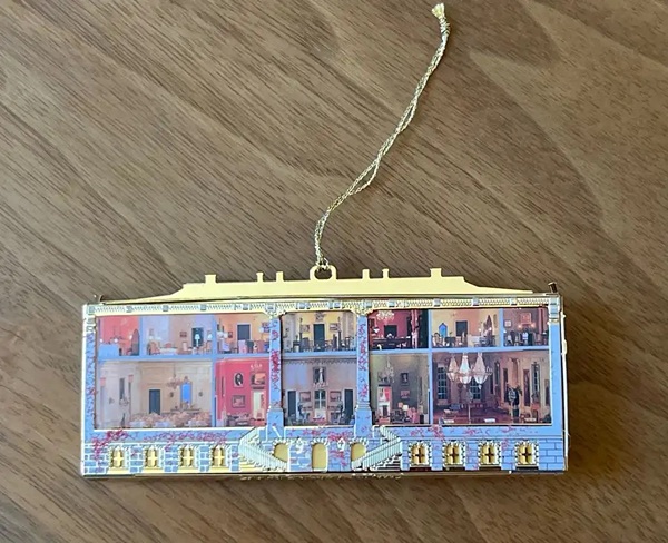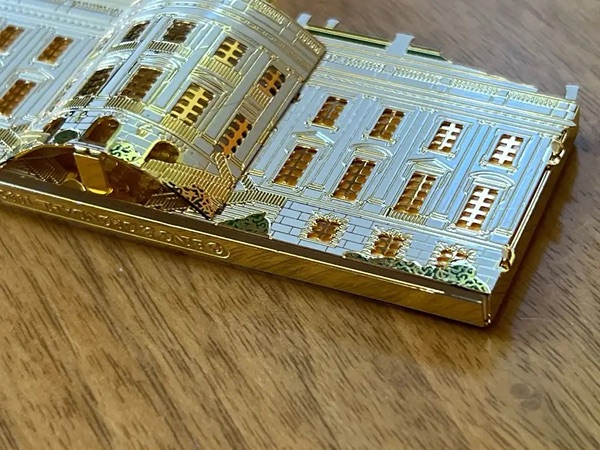 This is a gold ornament of the White House South Portico by Bing and Grondahl. It is in excellant condition. Made of brass and 24k gold plated with detailed etching and considerable work to replicate the actual White House. The pictures of the rooms are of a plastic coated paper for durability. The windows and doors are actually cut out. It is 3 3/4 by 1 3/4 inches.