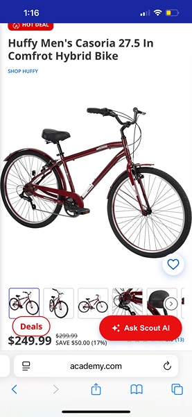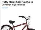 Huffy Casoria 27.5 “ Comfort Hybrid Bike. The Perfect Fit Aluminum Comfort frame encourages durability and comfort, while the deluxe comfort spring saddle seat and premium dual density grips promotes comfortable travels. The Shimano 7-Speed Revoshift derailleur supplies convenient controls and the linear pull brakes deliver crisp stop and go action.