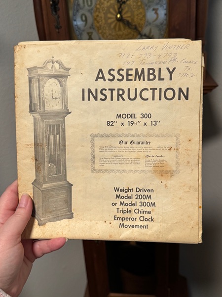 1972 emperor grandfather clock. It has a German timepiece 300 movement, with moon cycle, and solid cherry case. This heirloom clock has been in our family for over half a century.