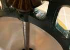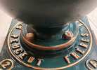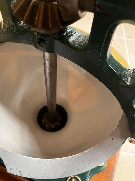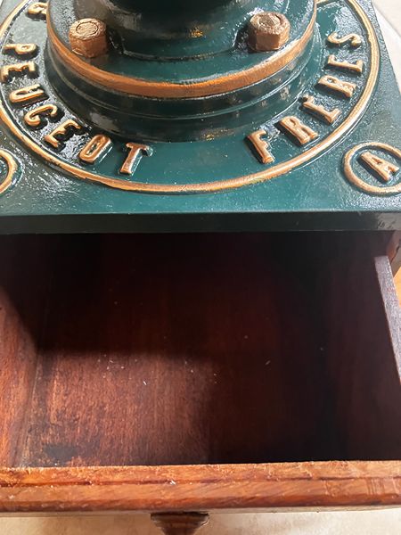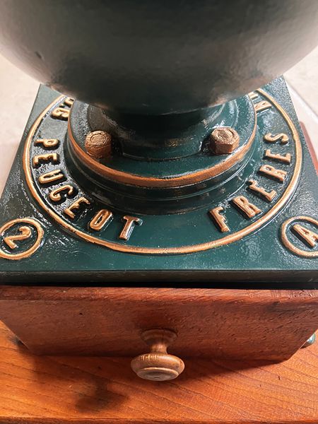 Antique restored French coffee mill mfg. by Peugeot Freres Co. Bead blasted, primed and painted. Grinding mechanism cleaned and functions as it should. Wheel diameter is 14" and base is 12"x12"
