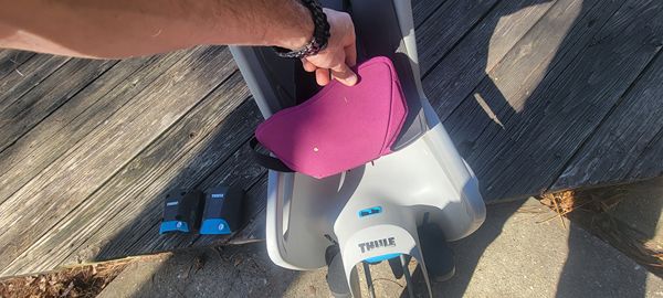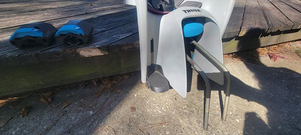 This Thule Bike Seat is used but works great. It comes with everything included in the pictures which means it is missing the key to lock the mounts to your bikes and it is missing the two straps that go over the child's feet. We are located near the Woodlands High School.