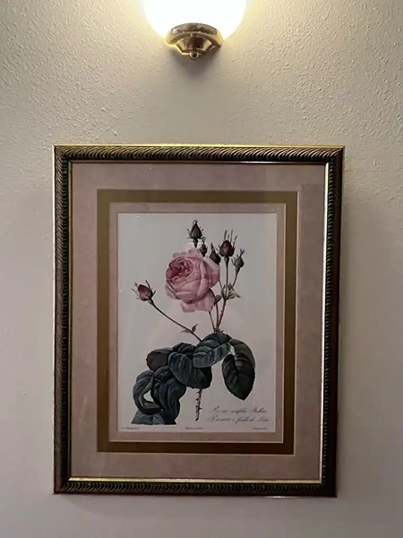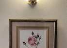 Elegant framed botanical print of a rose with gold accents. Approx. 22 1/2” x 18.25”. Slight blemish in one area, hard to notice (see last pic)…$20 firm