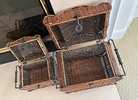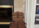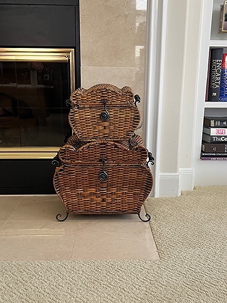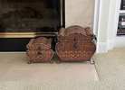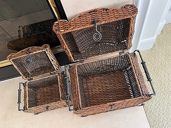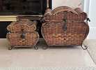 Two wicker baskets with decorative metal accents, perfect for storage or decor.