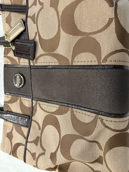 Genuine Coach Purse in brown tones, used once. Size 13x11. Tag Coach. Leather handles and handles. Outside snap pocket. Inside Zipper pocket inside with two pockets.
