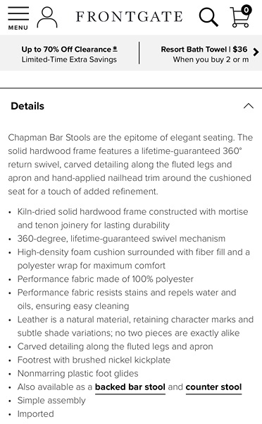 Frontgate Chapman Bar Stools, excellent condition like new! Performance linen look fabric. Dimensions see photo below.