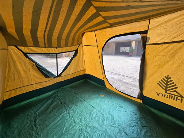 This Sears "Hillary" Tent measures a very comfortable 10' x 12' and is made of a high-end waterproof canvas along with mesh screening for double windows allowing for very good air flow. The tent is 7' a it's highest point. The tent is fully operational and in very good condition with no rips. It has a working zipper, and includes poles and stakes included along with plastic ground cloth. Reduced price is $385.00 - cash only. If interested, text or call. Thank you.