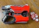 Are you ready to bring some multi-shot madness to your next mission? The Diatron blaster lets you send two discs hurtling toward your target at the same time with every shot. Firing this fast is no problem, because the blaster's built-in drop-down magazine snaps open for fast, easy reloading. The Nerf blaster's Tactical Rail is compatible with any Tactical Rail accessory (sold separately), so you can upgrade at will for even more strategic advantage. The XLR Disc Tech Nerf Gun Blaster hurls the bright orange Vortex discs an ultra-long distance, with twice the firepower and twice the disc blasting action. Assembled Product Dimensions (L× W x H)