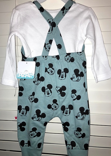 Disney baby brand 2-pc set. Includes white thermal top and blue-green overalls with all over Mickey faces pattern. Size 12 months. New with tags from smoke free home. $15