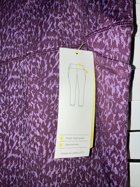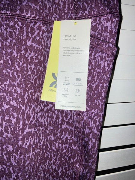 Brand is All in Motion, color is mulberry, size is XS. Mesh panel, side pockets, moisture wicking, flat seams, UPF 50+. New with tags from smoke free home. $10