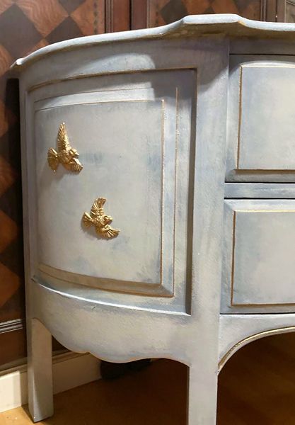 - We cleaned, filled, sanded, primed, added layers of creams and blues for a beautiful cloudy sky look. Then I applied hand poured moulds of birds, gilded and sealed for durability.