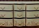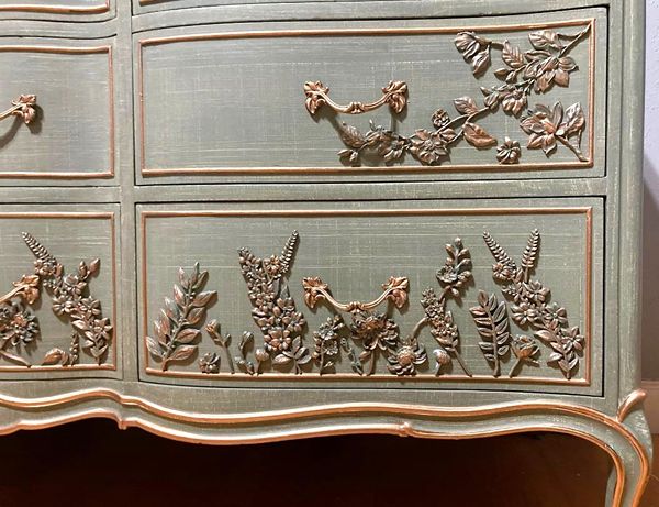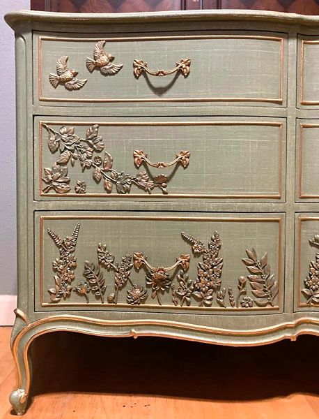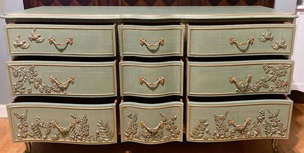 - Re-imagined, all wood, Drexel Touraine, French country, 9 Drawer Dresser is ready for your home.- We cleaned, filled, sanded, primed, added worn linen paint in layers, Hand poured moulds of florals and birds then attached, finally we gilded and sealed for durability.- I created the textured look of lovely linen texture with a painting technique. It's hard to see it in pictures but it is a very luxurious feel and look in person.- All drawers are sturdy, dove tailed and glide smoothly in and out on their center wood rails with original polished hardware.- Solid and sturdy wood construction of Drexel features sweeping lines and Drexel solid wood construction.- Color is a soft thyme green color.- Dimensions: 36" Tall X 64" Wide X 22.5" Deep
