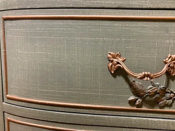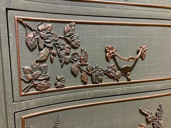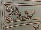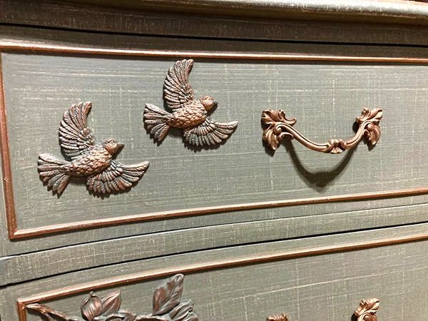 Elegant Drexel Touraine, Thyme Green Linen Textured Dresser w/Hand Poured Floral & Bird Molds Photos