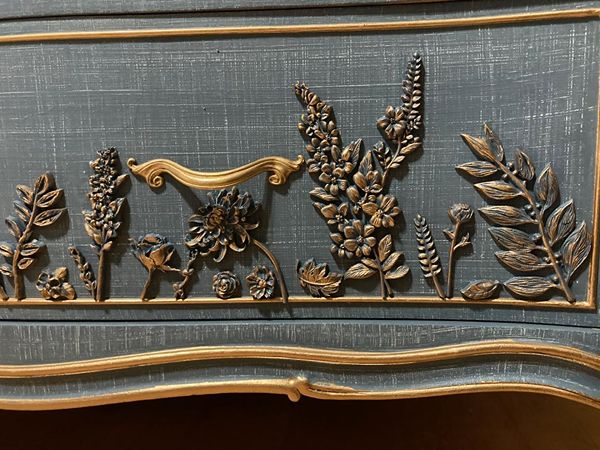 Elegant Drexel Touraine, Denim Textured Dresser w/Hand Poured Floral & Bird Molds Photos
