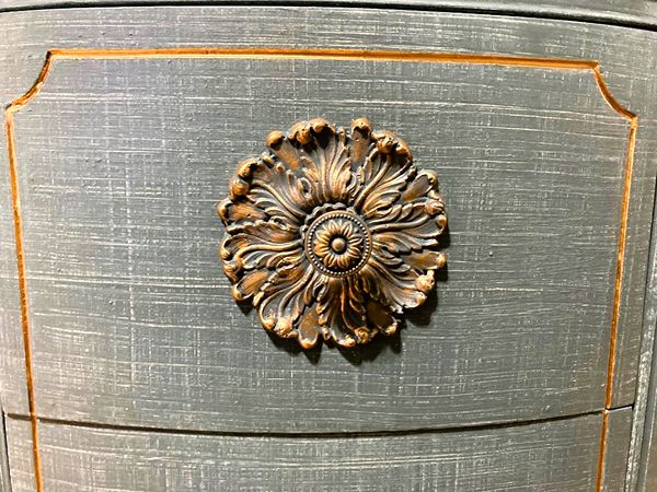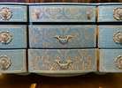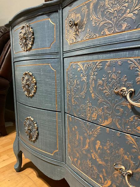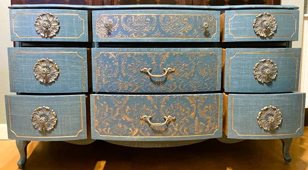 - Re-imagined, French country, 9 Drawer is ready for your home.- We cleaned, filled, sanded, primed, added worn linen texture paint and glazed in layers. We hand poured molds for backplates on the outer drawers and found some really pretty vintage handles for the front bottom drawers. Then we added raised stencil designn on the front and guilded it and used the same stencil for the sides unguilded, then sealed for durability.- I created the look of cozy worn denim with a painting technique. It's hard to see it in pictures but it is a very luxurious feel and look in person.- All drawers are sturdy and glide smoothly in and out.- Color is a lovely, worn denim blue.PLEASE TEXT 83two-four58-94one6