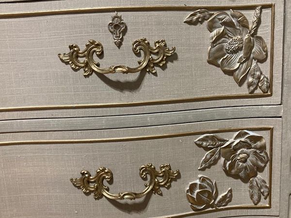 - We cleaned, filled, sanded, primed, added texture then lovely beige glazes in layers, Hand poured moulds of magnolias then attached, finally we gilded and sealed for durability.