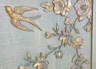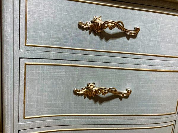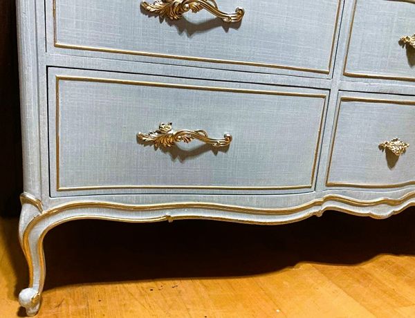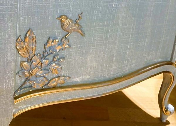 - We cleaned, filled, sanded, primed, added soft gray linen glaze in layers, Hand poured moulds of florals and birds then attached, finally we gilded and sealed for durability.