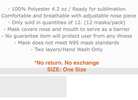 BAW Athletic Wear adult face masks, one size, style FM 1005. These are 2 layers with adjustable nosepiece, and they can be used in sublimation. These come 12/pack and are currently selling for $40/pack online. They are new and only removed from package long enough to get a picture. I have 28 of them. Smoke free home. $5/all